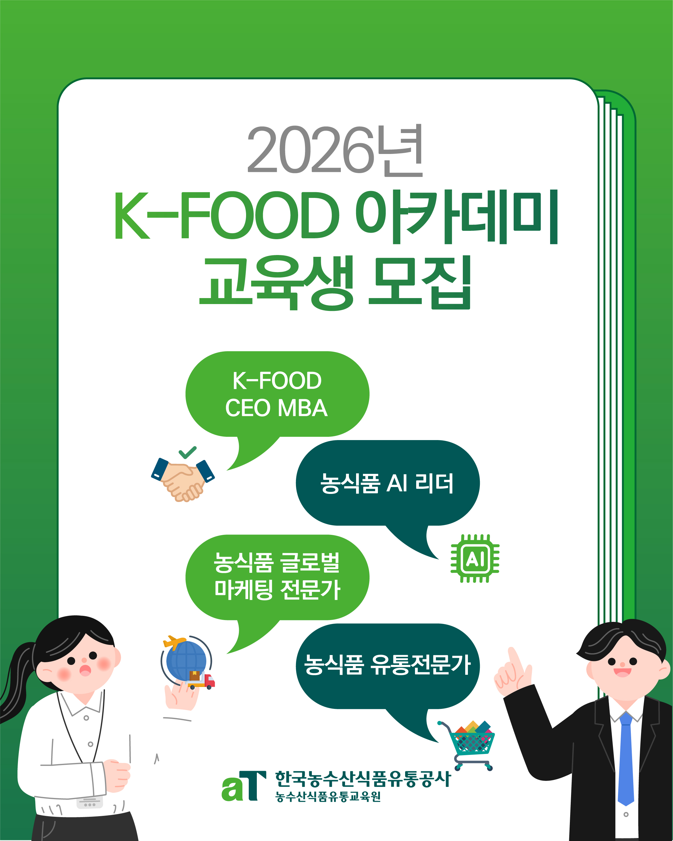 조회447aT농수산식품유통교육원에서는 농식품 전문인력 및 AI 융합 인재 양성을 위해「2026년 K-FOOD 아카데미」 교육 과정을 운영하고 있습니다.