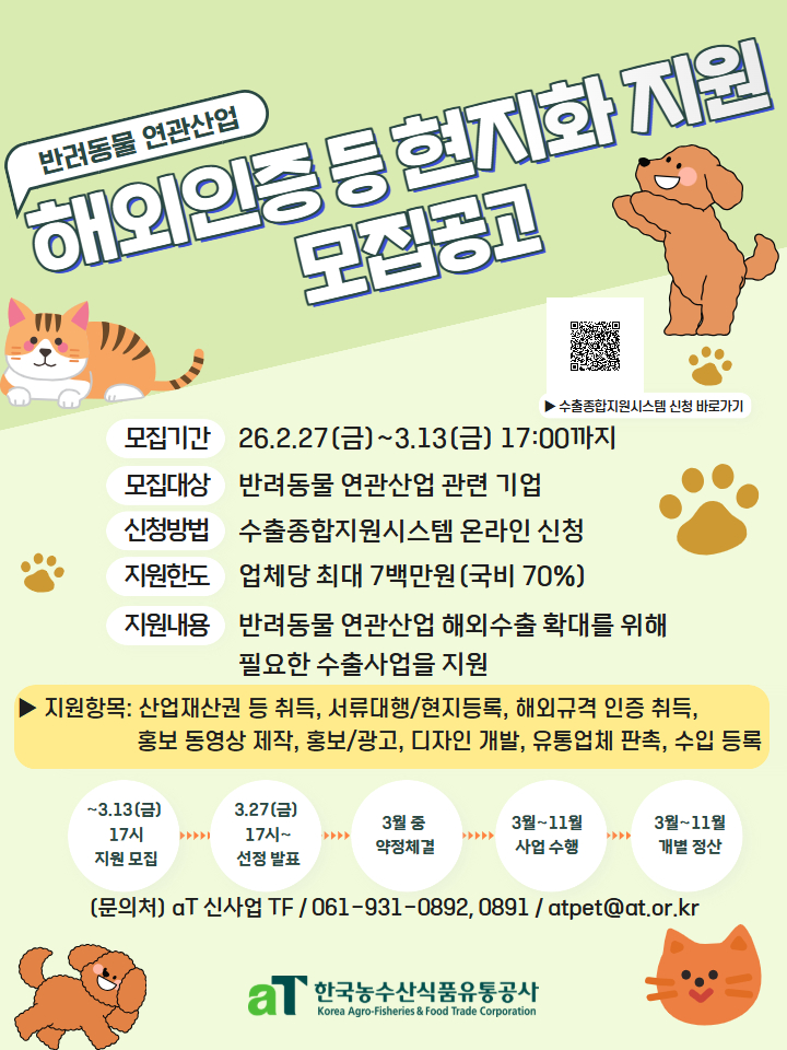 '[반려동물 연관산업] 2026년 해외인증 등 현지화 지원사업 모집공고' 저작물은 "공공누리 4유형 출처표시 + 상업적 이용금지 + 변경금지" 조건에 따라 이용할 수 있습니다.