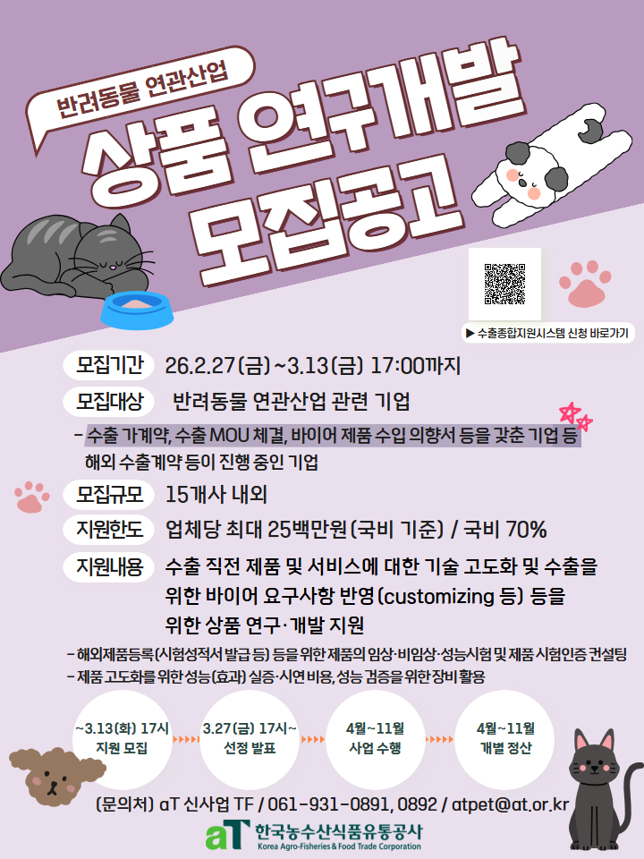 '[반려동물 연관산업] 2026년 상품 연구개발 모집공고' 저작물은 "공공누리 4유형 출처표시 + 상업적 이용금지 + 변경금지" 조건에 따라 이용할 수 있습니다.