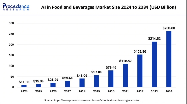 글로벌 시장 조사 전문 기관인 프리시던스(Precedence Reseach)의 통계에 따르면 식음료 분야의 AI 시장은 2025년 약 153억 6천만 달러로 (한화 약 22조 2,700억 원) 추산되었으며, 2034년 약 2,638억 달러(한화 약 385조 1,870억 원)로 성장할 것으로 전망된다. 2025년부터 2034년까지 연평균 37.3%의 높은 성장률에 달할 것으로 예측되는 등 글로벌 식품 산업에서 AI 기술의 중요성이 빠르게 확대되고 있다. 이러한 시장 확대 흐름 속에서 AI는 전반적인 식품 체인의 연구개발, 제조, 물류·유통, 마케팅 등 전 단계에 적용되며 현재는 제품 품질 예측, 공정 최적화, 소비자 맞춤형 대응 서비스 등에서 구체적 성과를 창출하고 있다. 유럽 기반의 디지털 서비스 플랫폼인 메이커 버스(Maker Verse)의 '2024년 유럽의 AI 분야의 제조 및 생산 조사'에 따르면 유럽 제조기업의 상당수가 AI를 중요한 요소로 평가하고 있으나 실제 도입률은 아직 13.5%에 머무르고 있어, 향후 성장 잠재력이 큰 시장으로 주목받고 있다고 전했다.