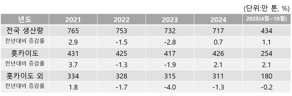 지역별로 보면 홋카이도는 426만 톤(전년 대비 2.1% 증가)을 기록한 반면, 홋카이도 외 지역은 311만 톤(1.3% 감소)으로 감소세가 지속되고 있다. 용도별로는 우유 등 음용이 382만 톤(0.5% 감소)으로 하락 추세가 지속되는 반면, 유제품용은 351만 톤(2.0% 증가)으로 전년 감소에서 회복세를 보이고 있다.