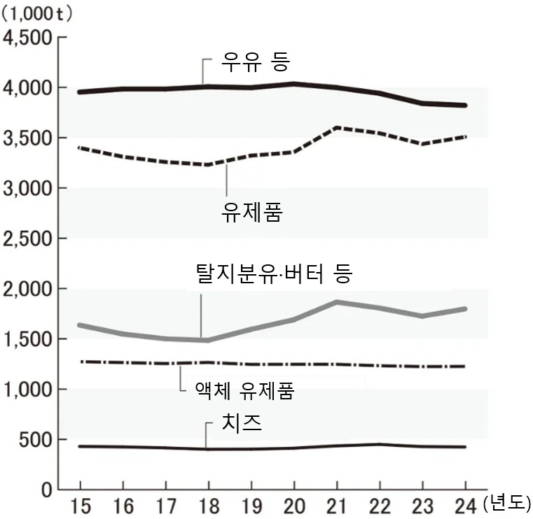 * 출처 : 우유유제품통계 – 농림수산성,지정 원유 생산자 단체의 위탁 판매 원유 생산량 등 – 농출산업 복구기구,용도별 판매 실적 – 중앙낙농회의