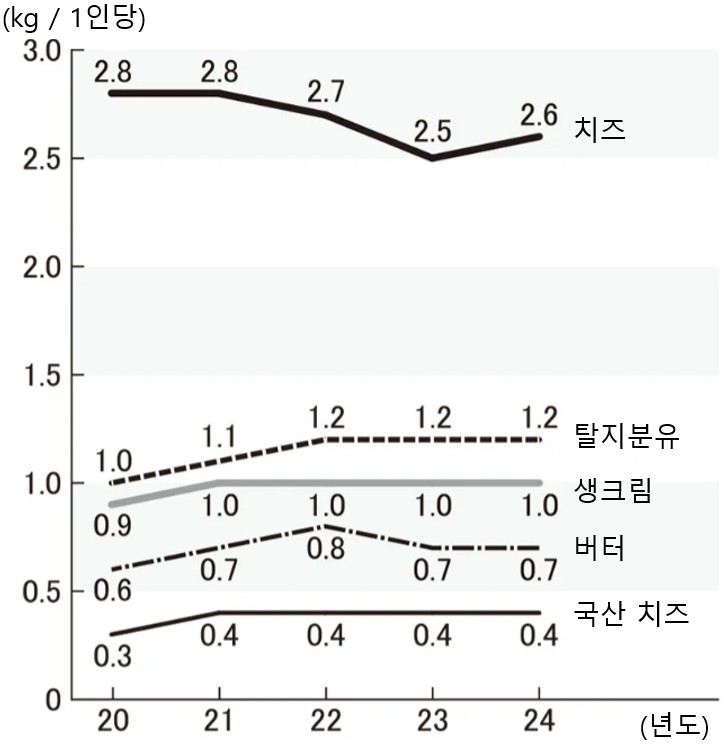 * 출처 : 식량수급표, 우유유제품통계 – 농림수산성,인구추계, 국세조사 – 총무성, 우유과 추계