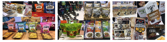 전통적인 칩의 다양한 변신으로 라임, 히말라야 바다소금, 스리라차의 세가지 맛을 아보가도 칩에 첨가한 Avolov사의 칩 종류들, 현미 가루를 뿌리고 한 입에 먹을 수 있는 크기로 개발한 Sea Snax사의 김 스낵, Mudlrk사의 검은 페퍼, 꿀·양파 머스타드, 매운 버팔로 맛의 버섯 칩과 쉬룸(Shrooms, 버섯의 일종) 칩도 새로 선보임. Barnana사는 아보카도 라임, 히말라야 바다소금과 식초, 브라질 바비큐 등으로 만든 칩을 선보였으며, Bubba’s Fine Foods 제조사도 버팔로, 마늘 파르마, 마초 나초(Macho Nacho) 세 종류 맛의 스낵들을 전시함.