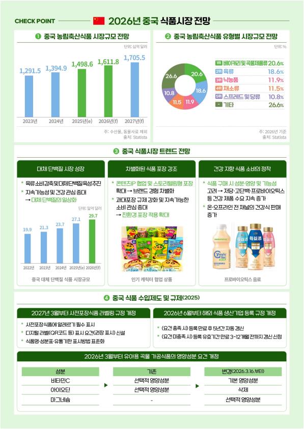 '중국 2025년 식품시장 트렌드 및 2026 전망' 저작물은 "공공누리 2유형 출처표시 + 상업적 이용금지" 조건에 따라 이용할 수 있습니다.