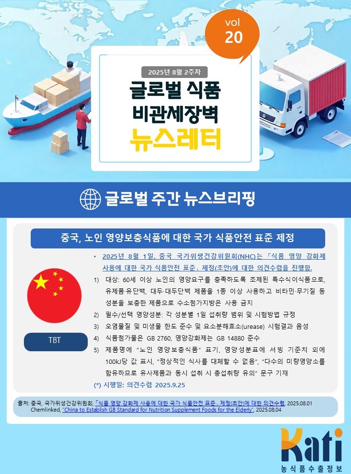 '8월 2주차 주요 비관세장벽 이슈 뉴스레터' 저작물은 "공공누리 2유형 출처표시 + 상업적 이용금지" 조건에 따라 이용할 수 있습니다.